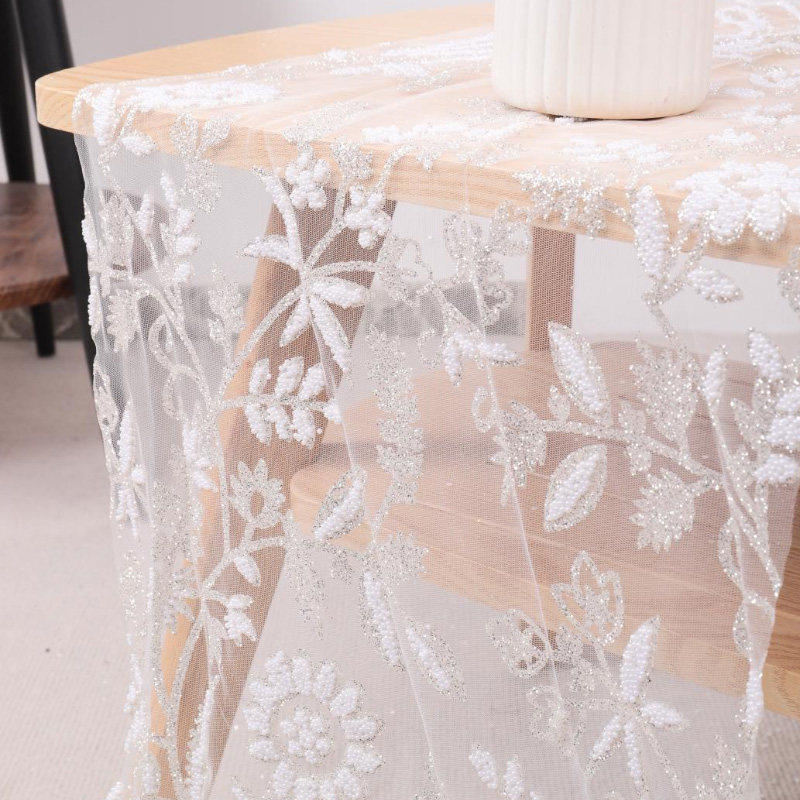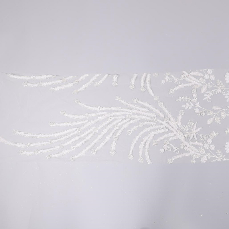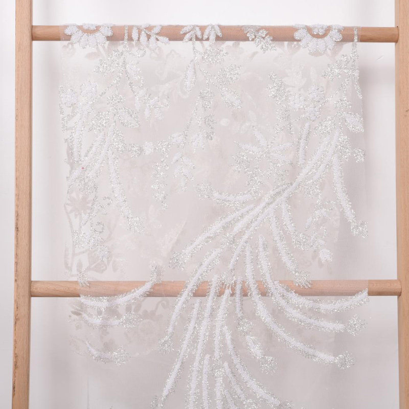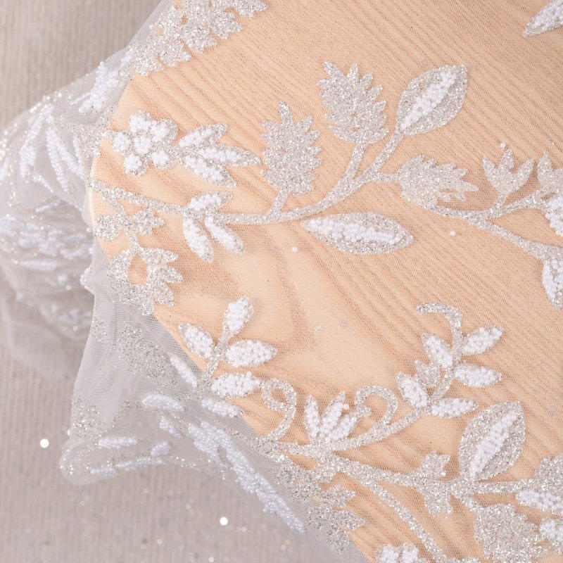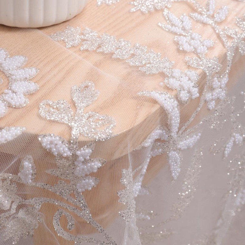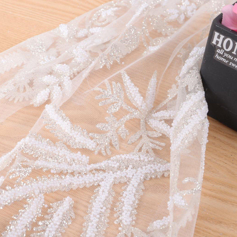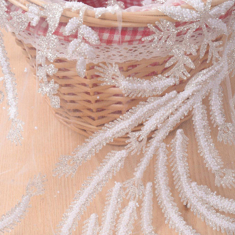 Gamit ang lace fabric, ang mga materyales na ginamit sa tela ay kinabibilangan ng foaming, glue beads, sequins na may mga butas, stereo drills, sequins, bead tubes, pearls, atbp. Karamihan sa mga tela ay kumbinasyon ng maliliit na sequin at iba pang materyalesï¼Ginagawa nito ang tela magmukhang mas three-dimensional at maganda.